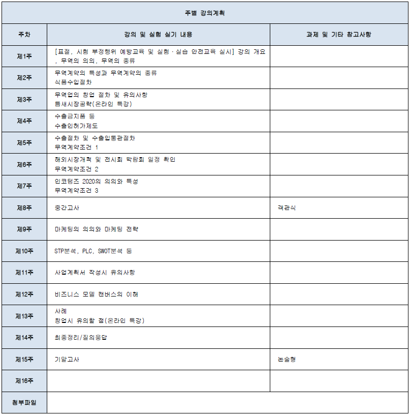 fnctId=bbs,fnctNo=9026 작성일 2021.09.07 수정일 2021.09.07 작성자 김부권 조회수 788 [교수계획표] 글로벌 수출전략(I) - 2021년 1학기 첨부파일 글로벌 수출전략(I) - 2021년 1학기.pdf 미리보기